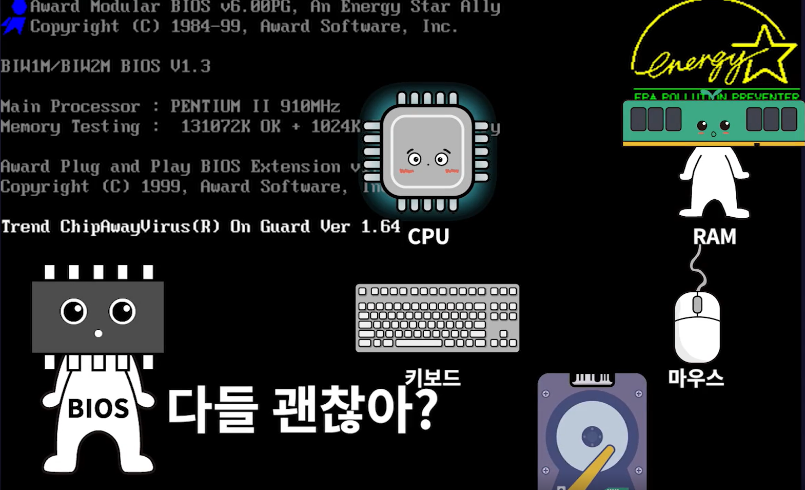 2. BIOS는 전원, CPU, 메모리, 키보드, 마우스, 하드디스크 등의 주요 하드웨어에 이상이 없는지 체크한다.