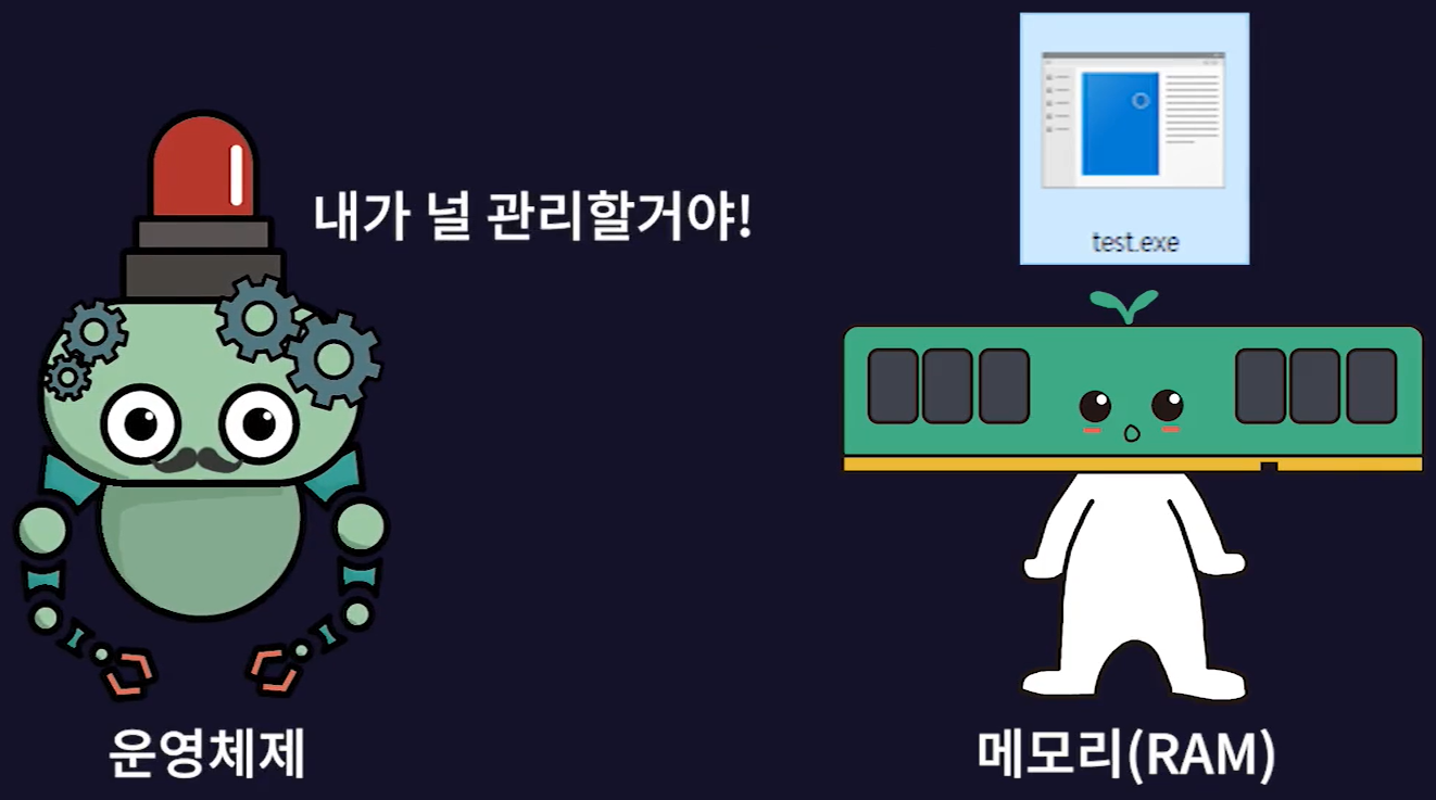 - 이제 해당 파일을 더블클릭하면 하드디스크에 있는 test.exe 프로그램이 메모리에 올라가게 되고 이렇게 올라간 프로그램은 프로세스라는 이름으로 불리게 된다.