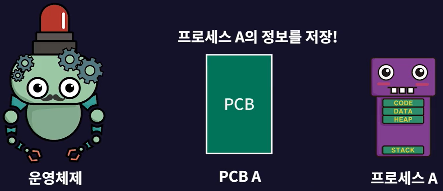 - 프로세스가 만들어지면 OS는 해당 프로세스의 정보를 가지고 있는 PCB(Process Control Block)를 만들고 저장한다.