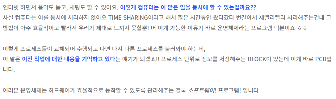 - PCB(Process Control Bolock)는 OS가 프로세스를 제어하기 위한 프로세스 상태 정보를 저장한 곳이다.