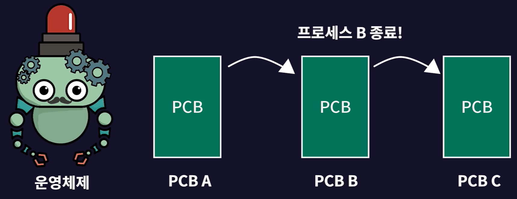 - OS는 프로세스가 종료되면 연결리스트에서 해당 프로세스의 PCB를 제거한다.