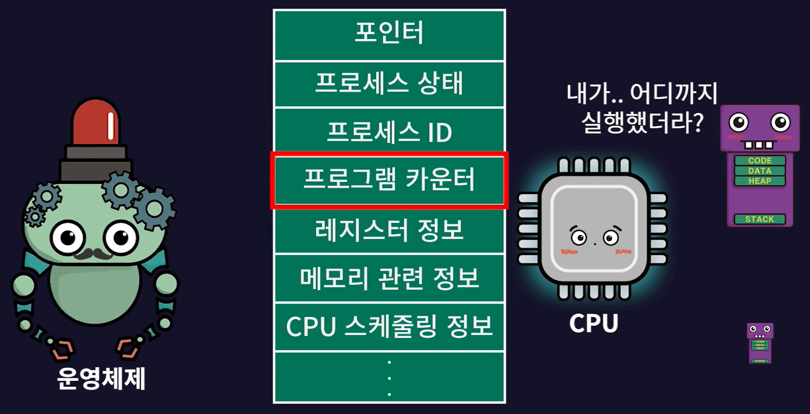 - 어떠한 프로세스가 실행되다가 다른 프로세스에게 CPU를 뺏긴 후 다시 실행될 때 원래 실행하던 명령어가 그대로 실행되어야 하기 때문에 프로그램 카운터는 반드시 있어야한다.