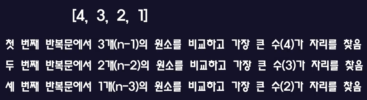 - 길이가 n인 배열에서 반복문을 한 번씩 돌때마다 마지막 원소가 정렬되는 것을 알 수 있었다.