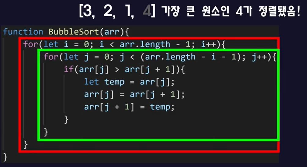 for (let j = 0; j < (arr.length - i - 1); j++) { // 각 원소의 크기를 비교하고 자리를 바꿀 for문