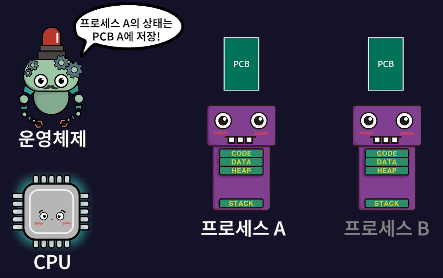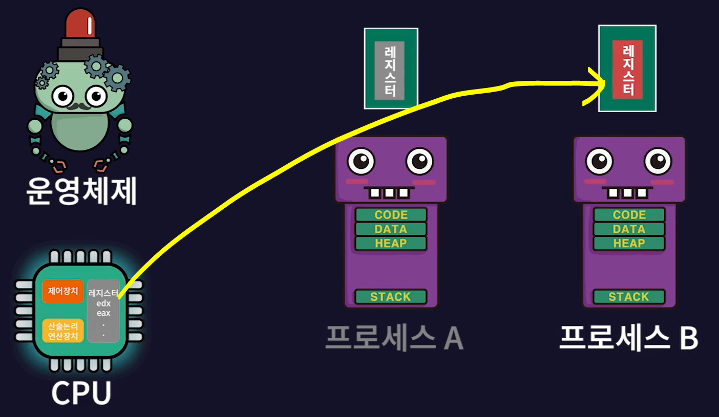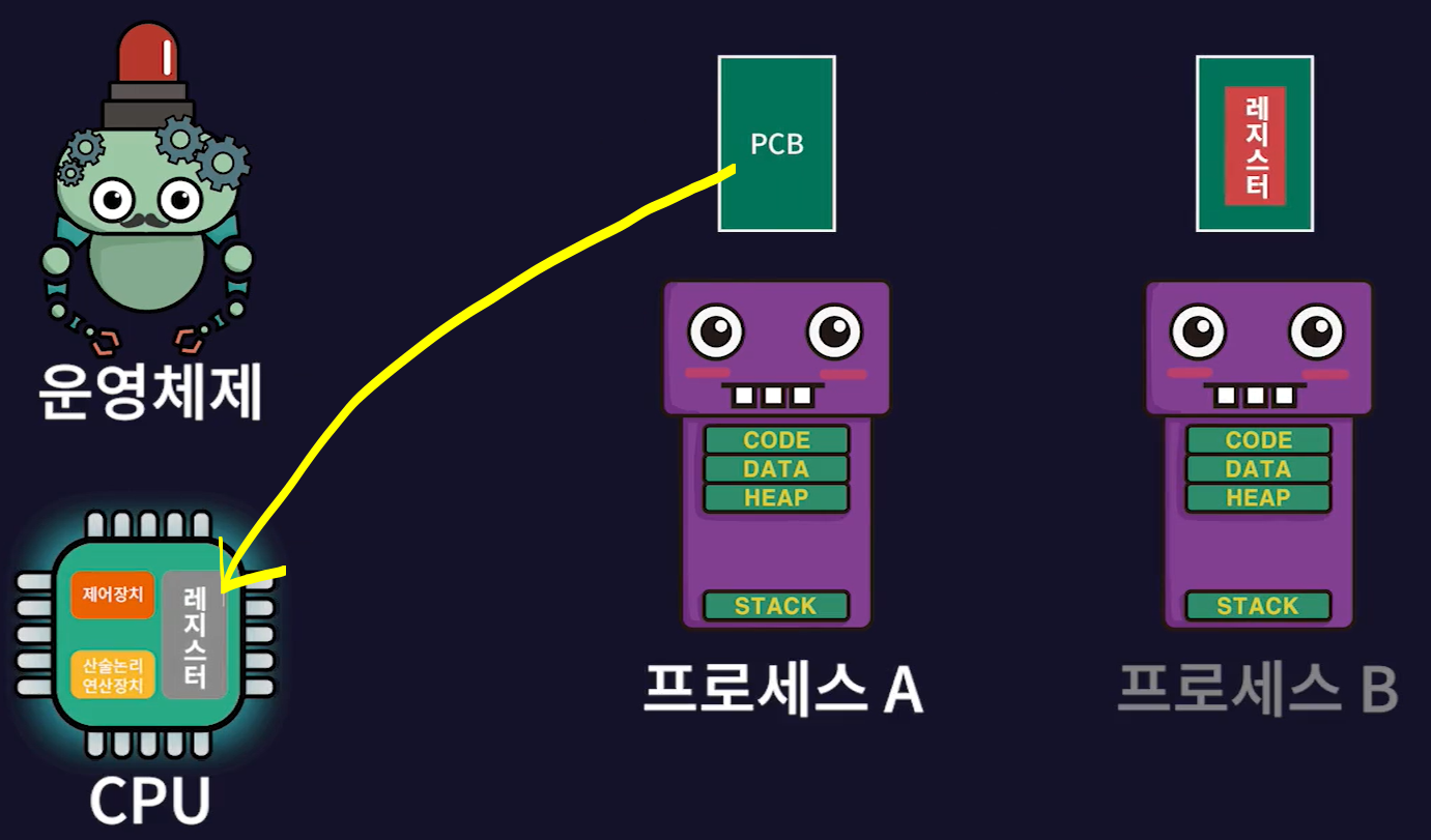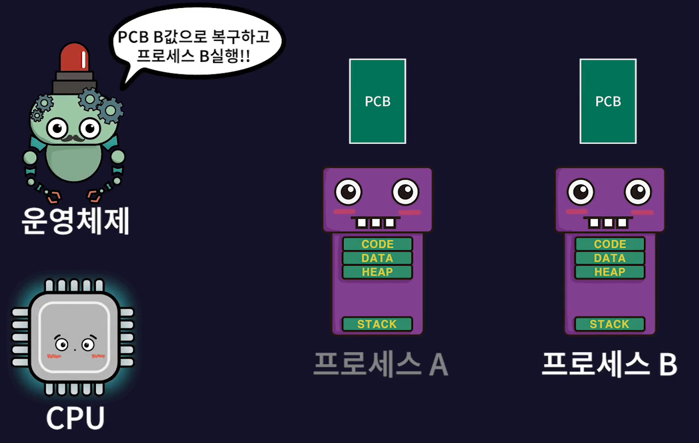 - 현재 실행중인 프로세스(프로세스A)의 작업 내용을 프로세스A의 PCB에 저장하고 실행될 프로세스(프로세스B)의 PCB 내용대로 CPU가 다시 세팅된다.