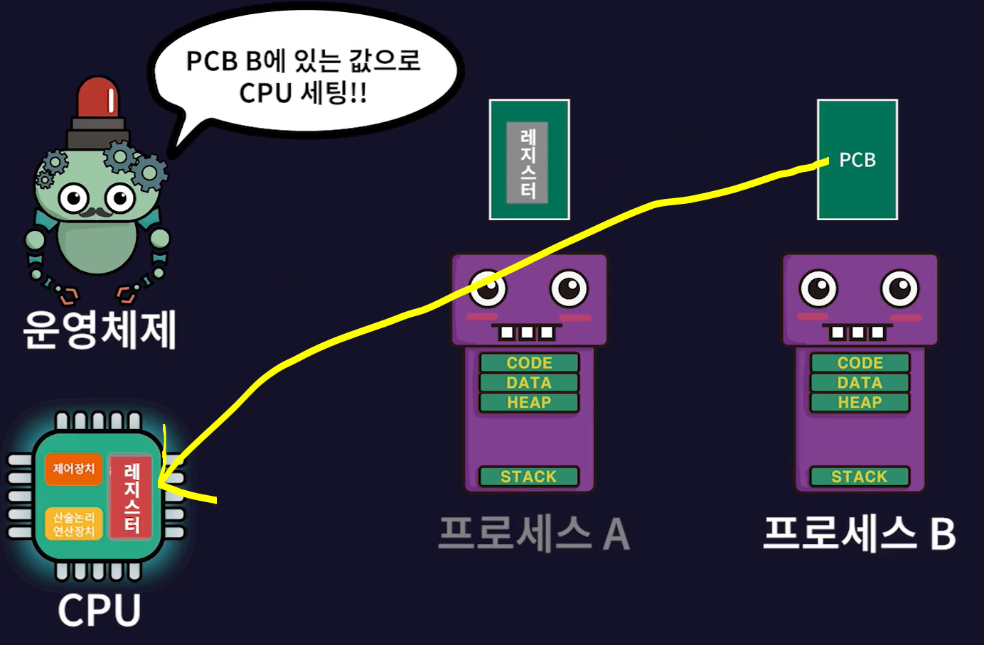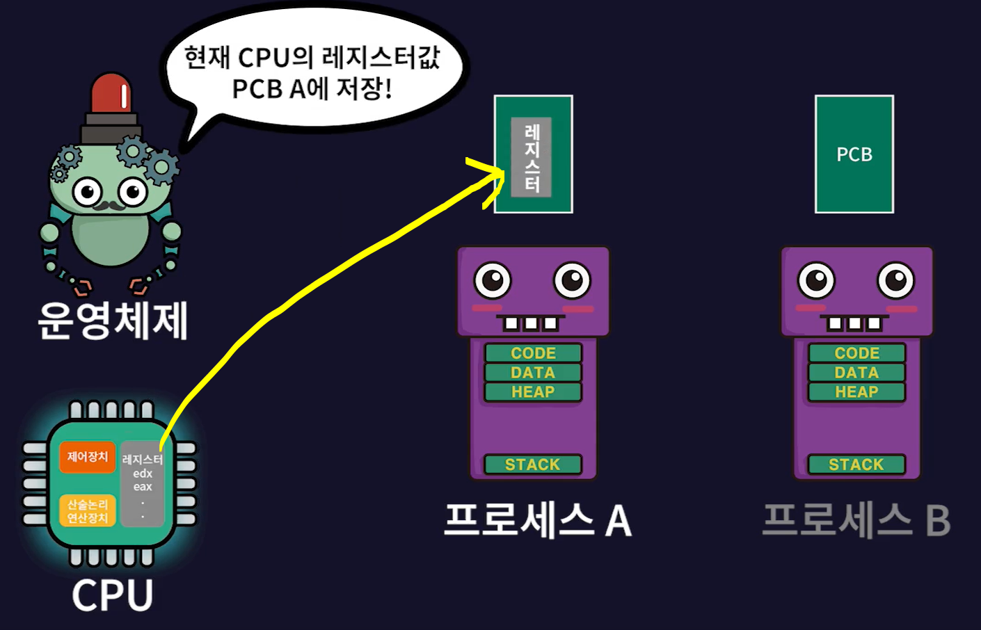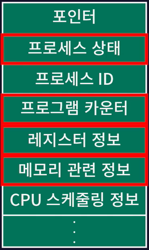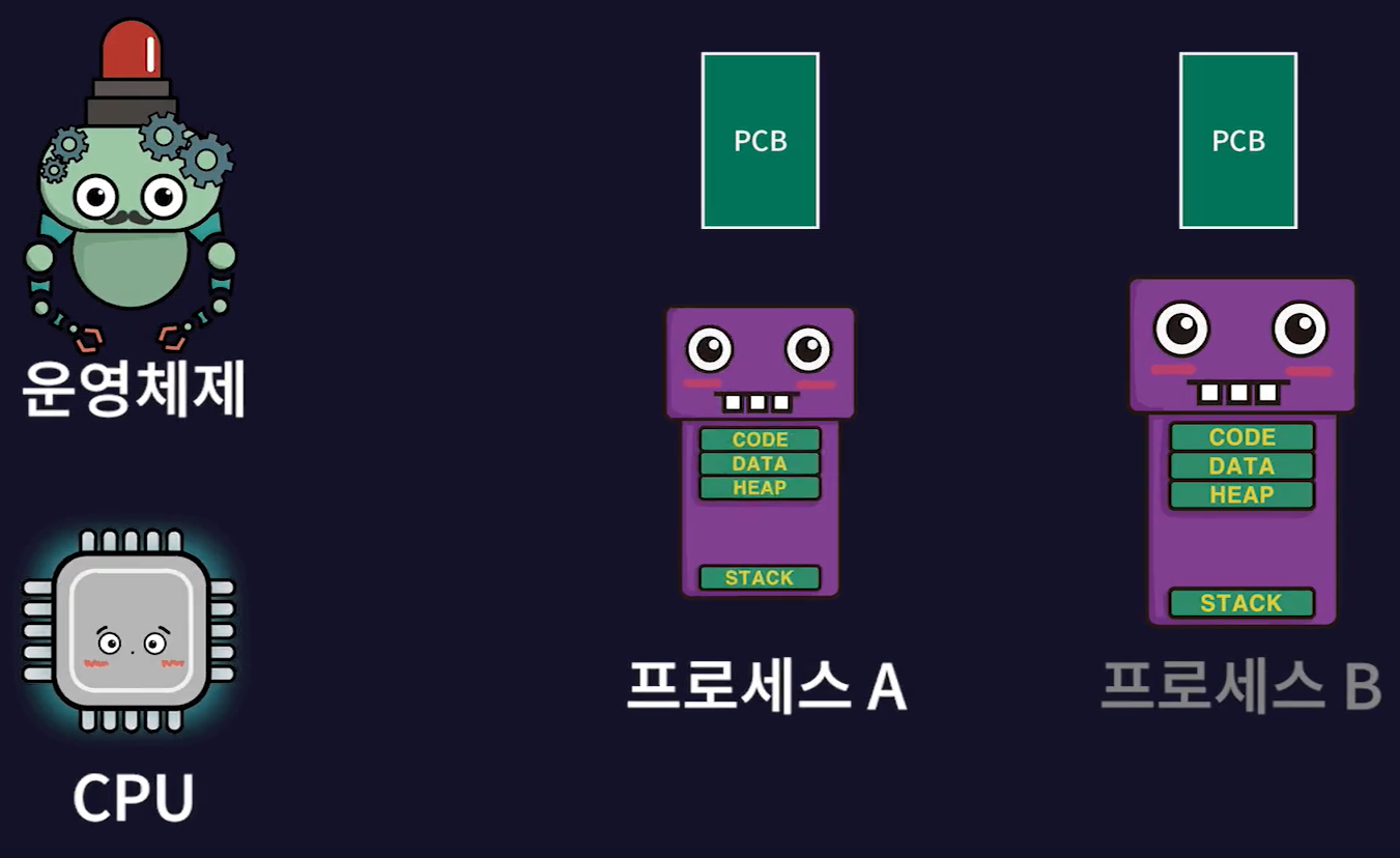 - 현재 실행중인 프로세스(프로세스A)의 작업 내용을 프로세스A의 PCB에 저장하고 실행될 프로세스(프로세스B)의 PCB 내용대로 CPU가 다시 세팅된다.