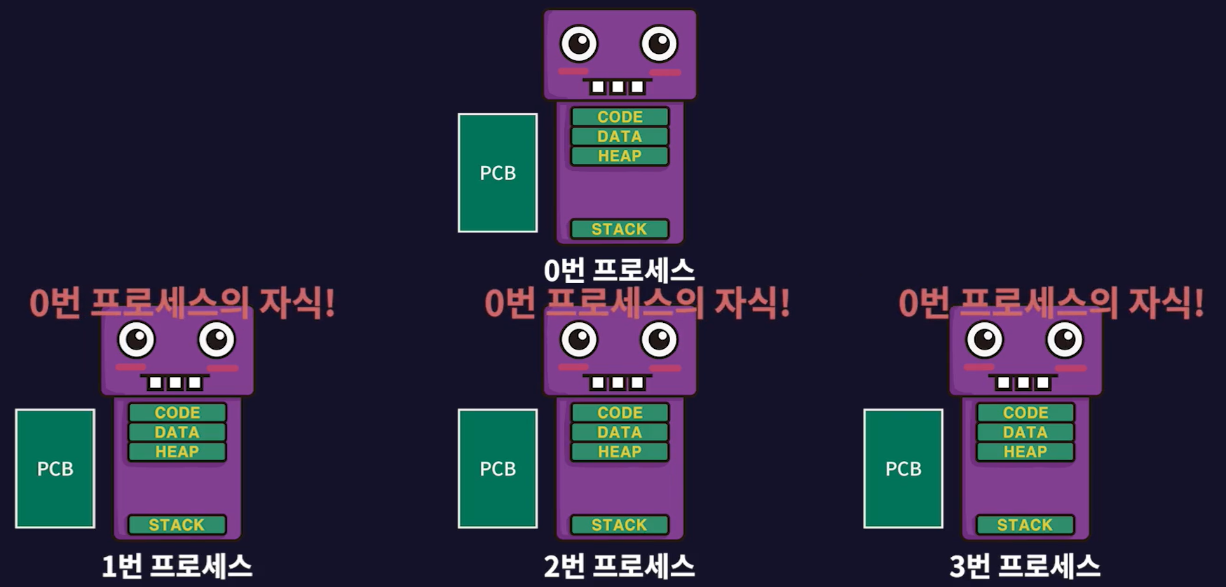 - 아래 그림의 1번, 2번, 3번 프로세스 모두 0번 프로세스를 복붙해서 생성된 프로세스들이다.