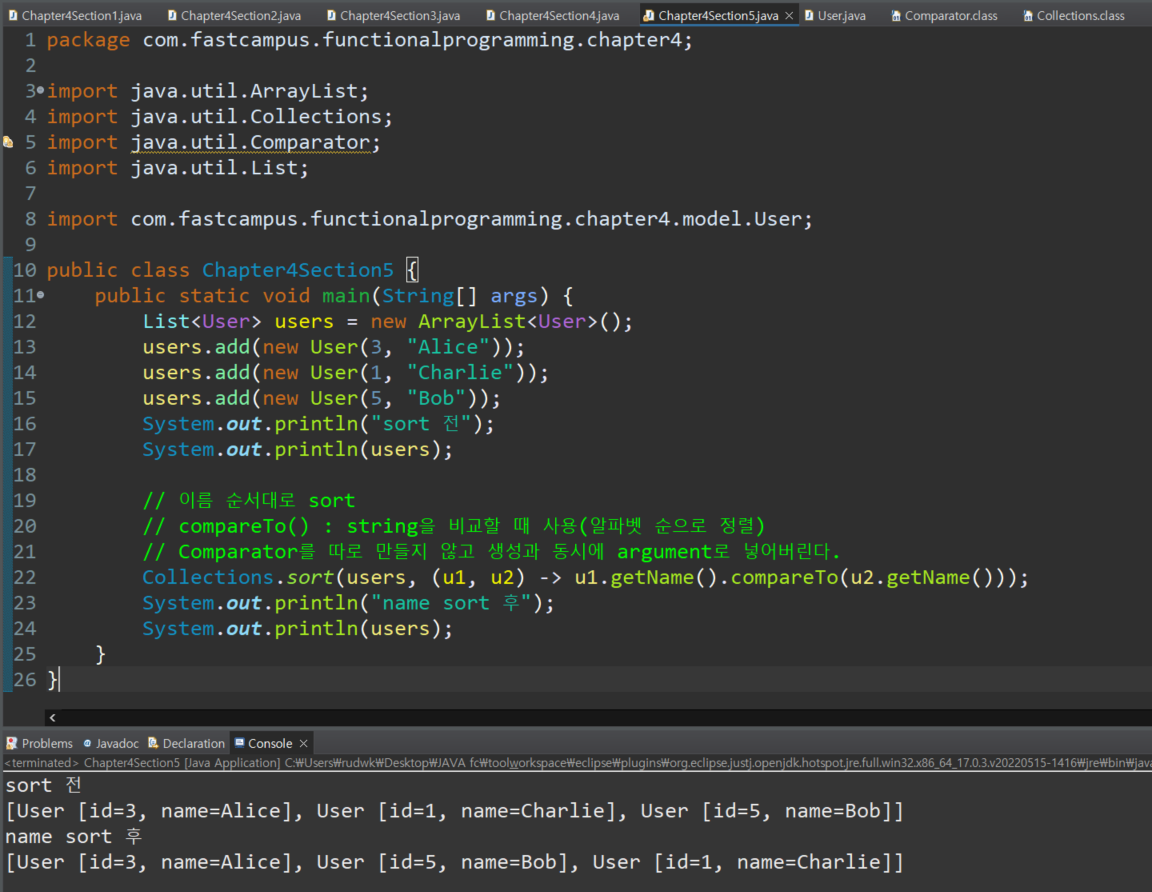 결과값 : [User [id=3, name=Alice], User [id=1, name=Charlie], User [id=5, name=Bob]]