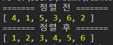 [1, 2, 3, 4, 5, 6] --> Insertion Sort이 끝난 모습