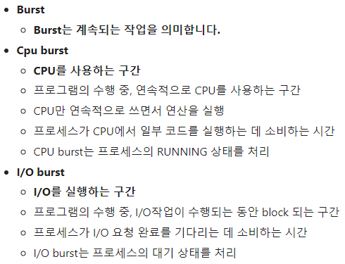 cf) CPU를 할당 받아 실행하는 작업을 CPU Burst 라고 부르고 입출력 작업을 I/O Burst 라고 부른다.