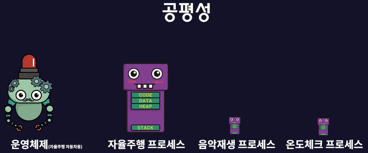 - CPU는 모든 프로세스에게 공평하게 할당되어야 한다. 단, 공평의 의미는 시스템의 종류에 따라 달라질 수 있다.