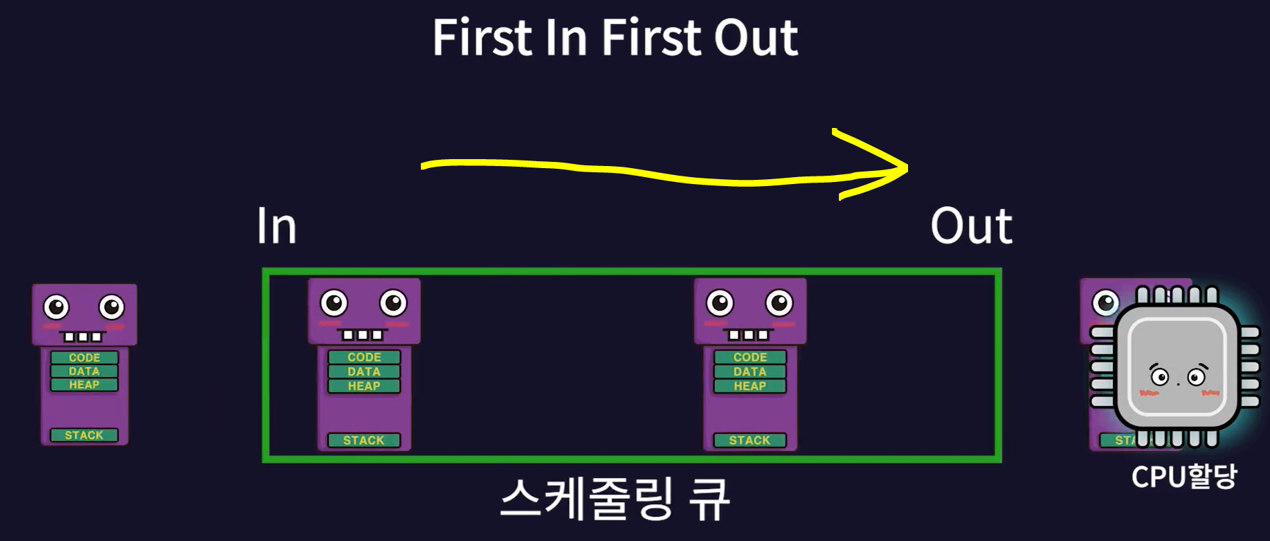 - FIFO(First In First Out) : 먼저 들어온 작업이 먼저 처리된다.(나간다.) 즉, 프로세스가 스케줄링 Queue에 들어온 순서대로 CPU를 할당 받는 방식이다.