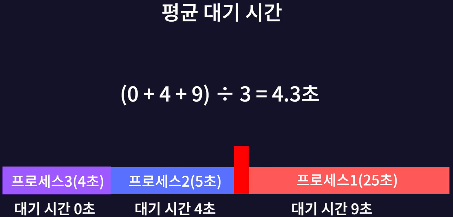 - 3개의 프로세스의 평균 대기 시간 = (0 + 4 + 9) / 3 = 4.3초이다.