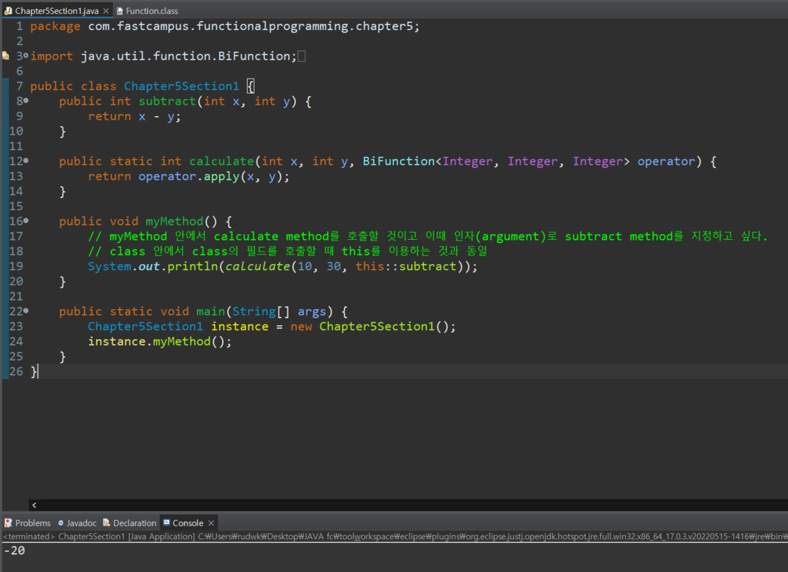 // 위와 같은 식으로 BiFunction을 따로 만들지 않고 아예 argument 자리에 생성과 동시에 보내버린다.