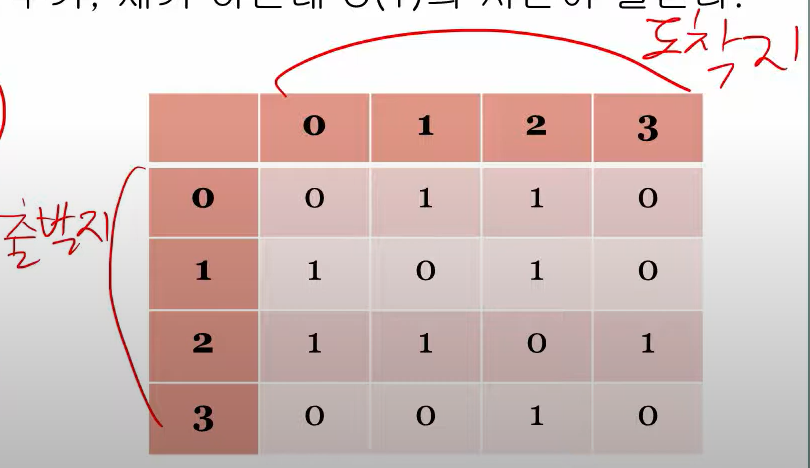 - 오른쪽의 표에서 행은 출발점(source), 열은 도착점(destination)을 의미한다.