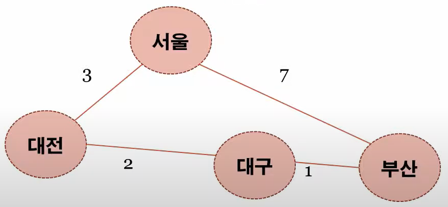 - 위 그림에서 (서울 ~ 부산)으로 직항으로 가는 길의 (가중치 = 7)이다.