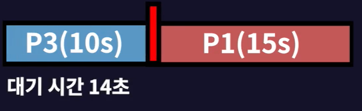 - P3는 P1과 P2의 실행이 완료될 때까지 14초를 기다렸다. 따라서 P3의 (대기시간 = 14초)이다.