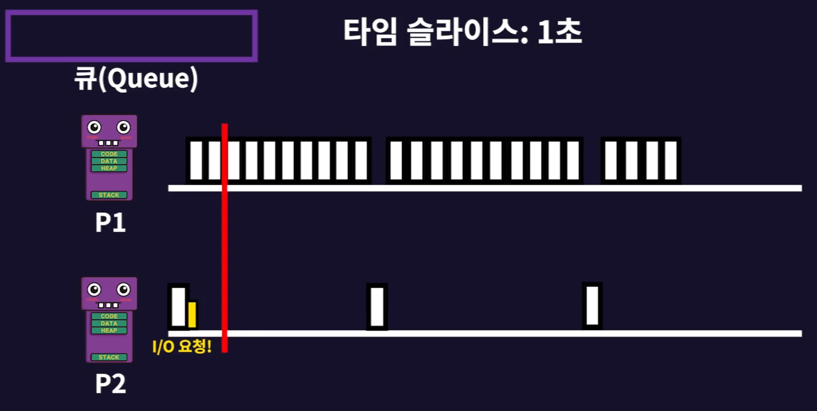 - P1 프로세스는 I/O 작업 없이 CPU 연산만 하는 프로세스이다.