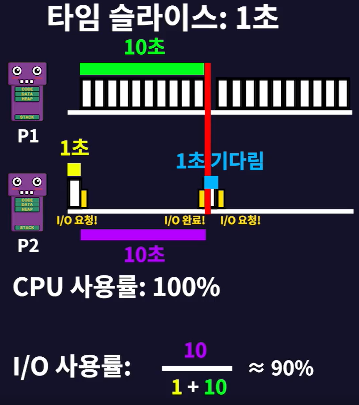 - Time Slice가 100초 → 1초로 작아질 때 P1은 손해를, P2는 이득을 보게 된다.