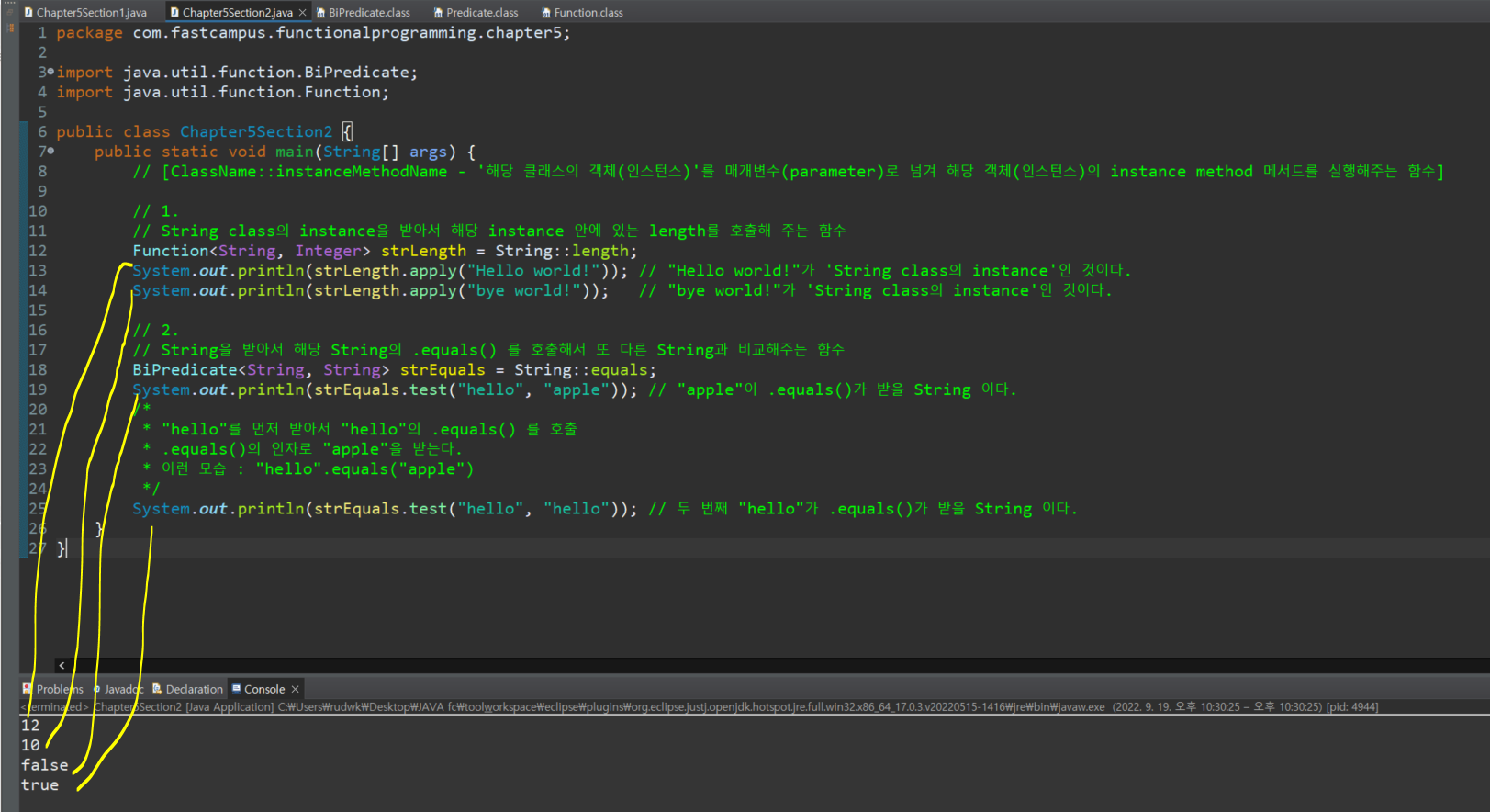 System.out.println(strLength.apply("bye world!")); // "bye world!"가 'String class의 instance'인 것이다.