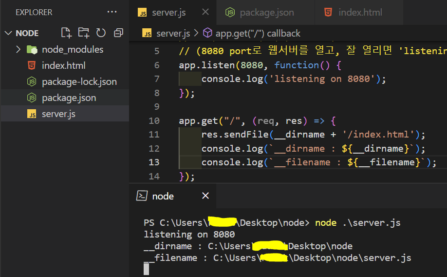- C:\Users\사용자명\Desktop\node 경로에 server.js가 있을 때