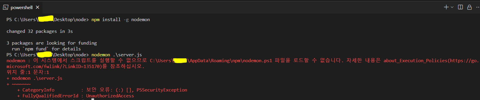 - nodemon 설치가 잘 된줄 알고 위의 명령어를 실행했는데 오류메세지가 나왔다.(PowerShell 보안오류라고 한다.)