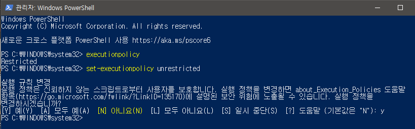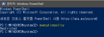2. executionpolicy 입력 → Restricted 라고 나오면 문제가 있는 상황이다.