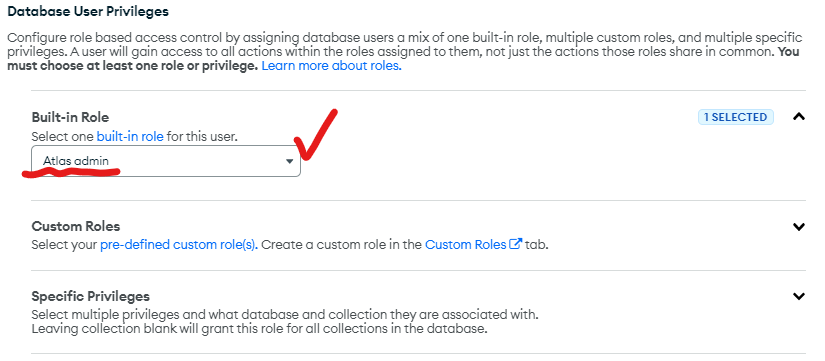 3-1. 주의 : 역할을 atlas admin으로 설정해야한다. (그래야 해당 ID를 통해 node.js에서 DB 접속 가능)