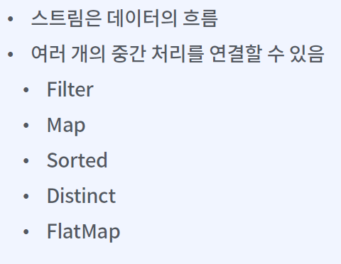 - For, while 등을 이용하던 기존 loop를 대체한다.(Stream을 배우면 For, while을 사용할 일이 없다고 한다.)