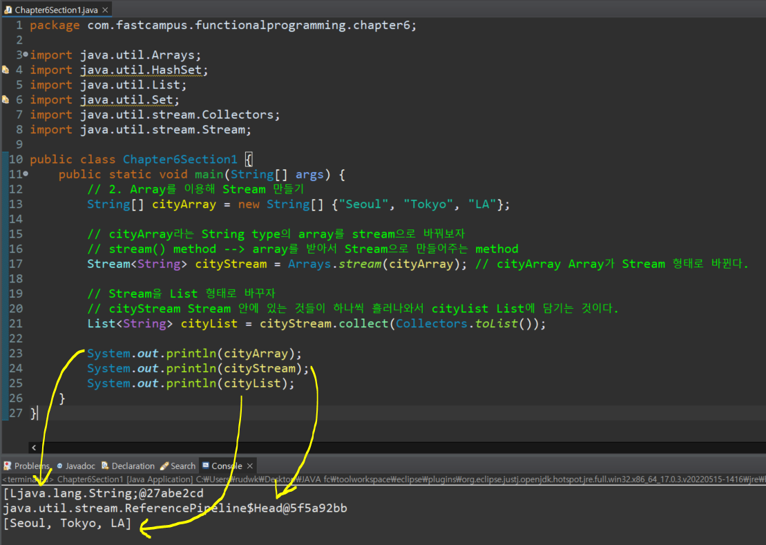 Stream<String> cityStream = Arrays.stream(cityArray); // cityArray Array가 Stream 형태로 바뀐다.