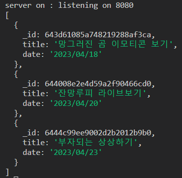 - 하지만 [object Object] 같은 모양을 사용자에게 보여줄 수는 없으니 원하는 제목과 날짜 데이터를 보여주려면 아래와 같이 코드를 수정하면 된다.