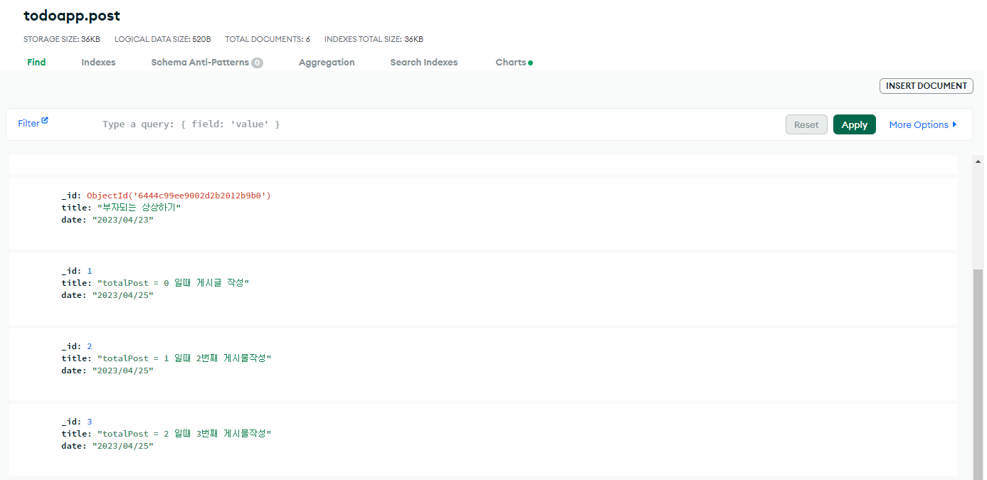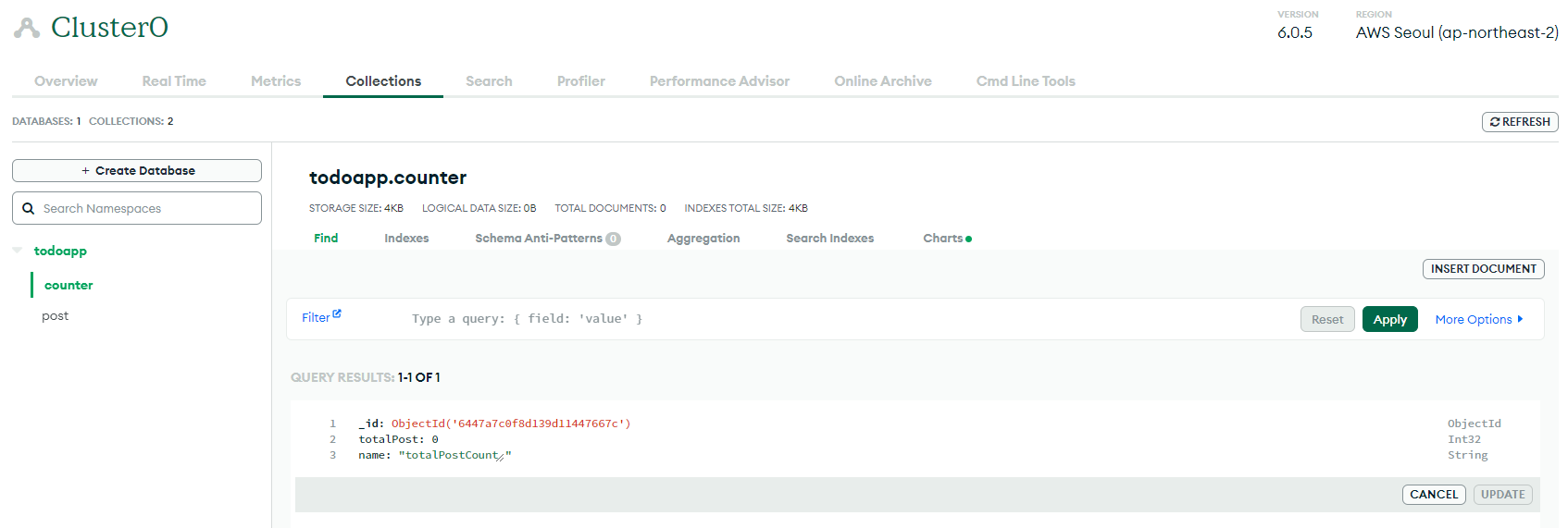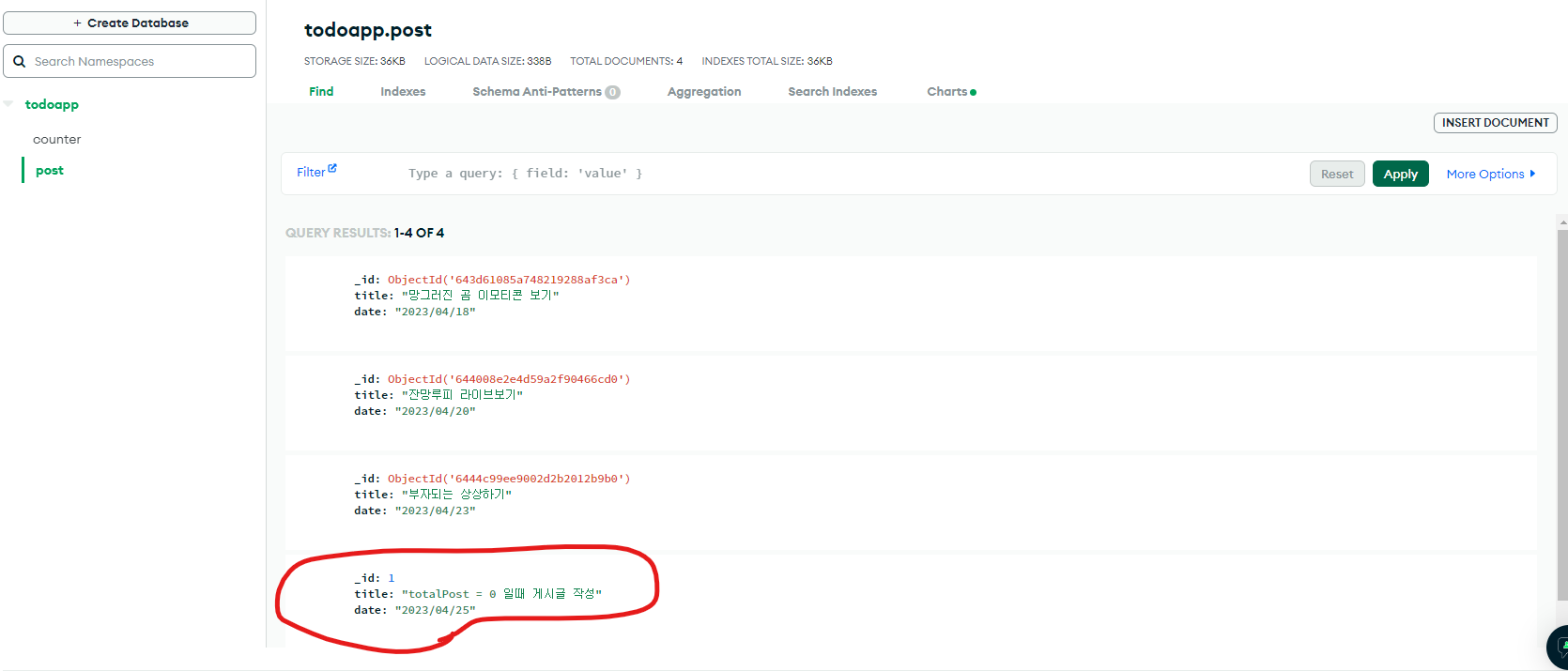 - 현재 counter collection의 상태는 아래와 같다.(totalPost의 값은 위의 update 코드짜느라 증가됐다.)