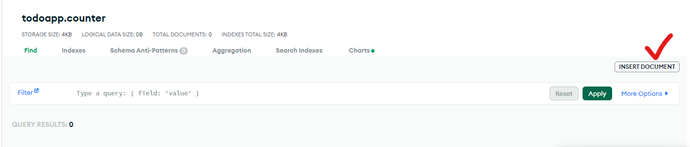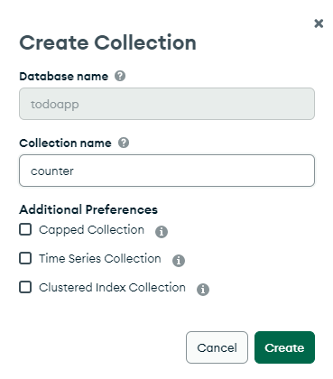 - (+) 버튼을 누른 후 counter라는 이름의 collection을 생성해보자