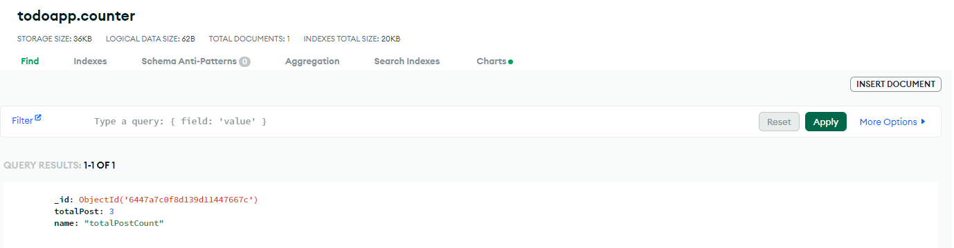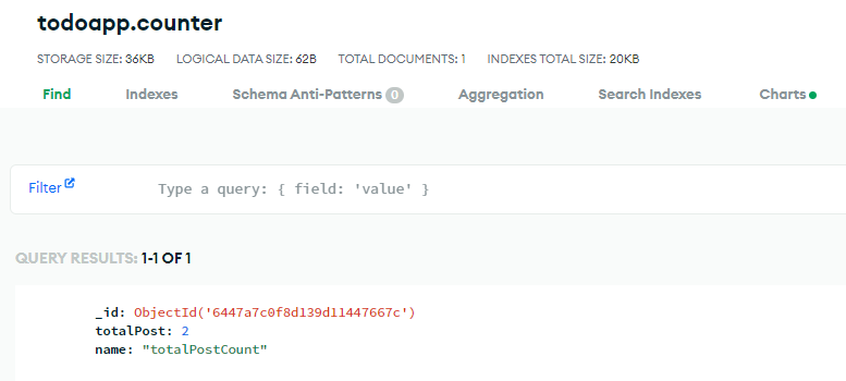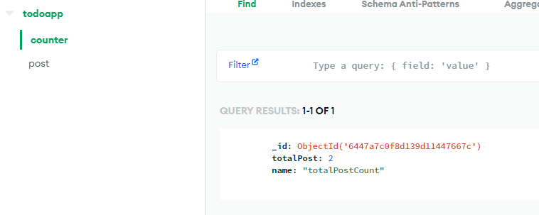 - 즉, counter collection에서 (_id, totalPost, name)이 들어있는 문서를 {name : 'totalPostCount'}를 이용해서 찾은것이다.