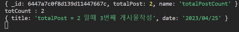 - 그렇다면 위의 사진을 기준으로 {_id : 6447a7c0f8d139d11447667c} 혹은 {totalPost : 2}를 이용해서도 Document를 가져와 원하는 값을 사용할 수 있는 것이다.
