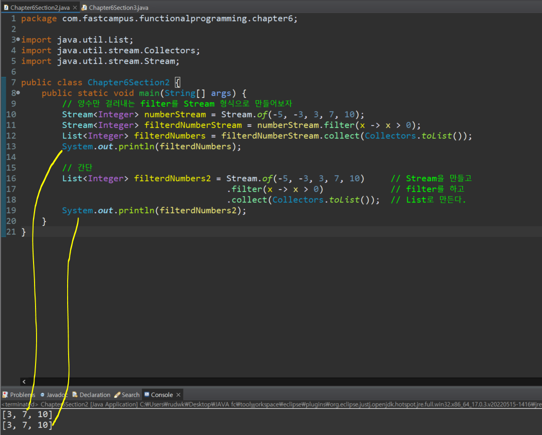 List<Integer> filterdNumbers2 = Stream.of(-5, -3, 3, 7, 10) // Stream을 만들고