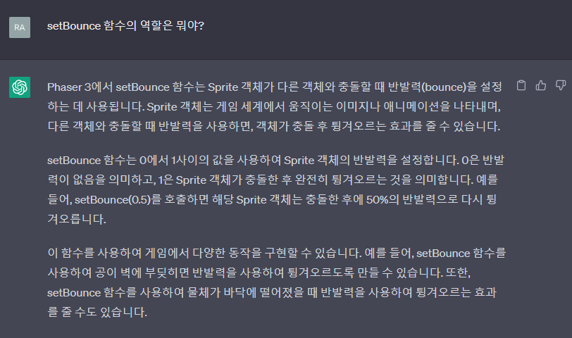 // setBounce 함수는 0에서 1사이의 값을 사용하여 Sprite 객체의 반발력을 설정