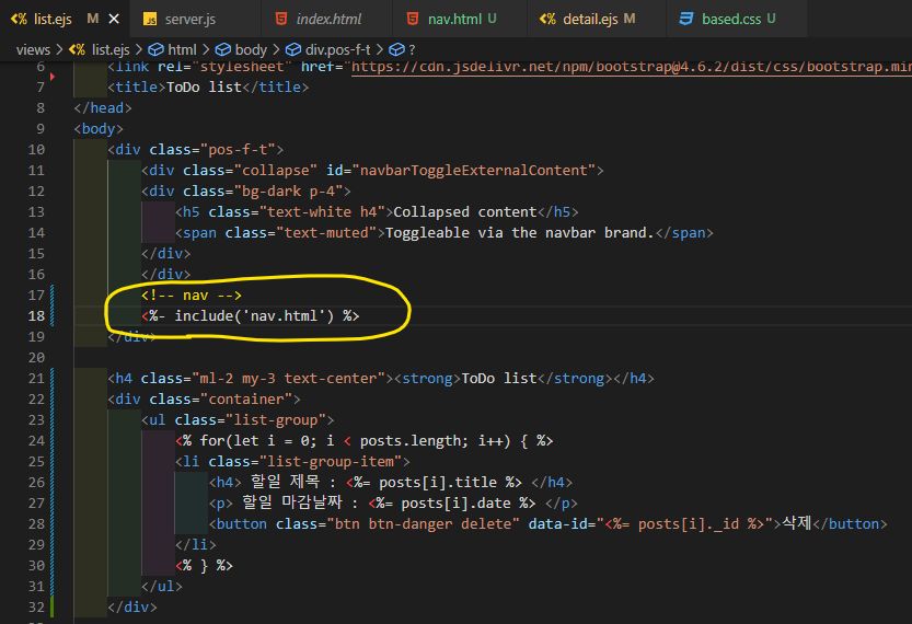 1. list.ejs에 있는 아래의 <nav> 태그 내용을 잘라내서 nav.html 파일에 붙여넣는다.