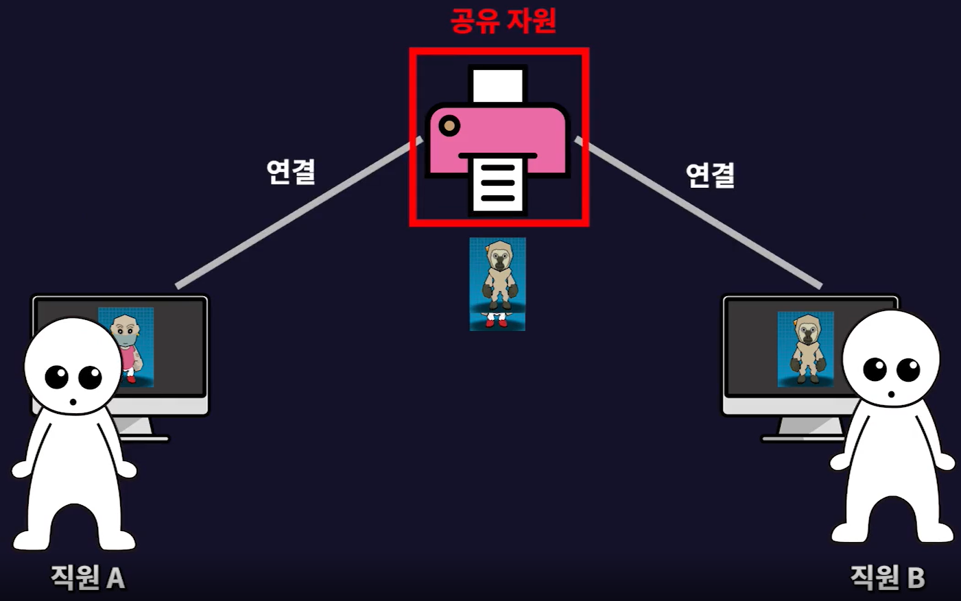 - 직원A와 직원B가 동시에 프린터 출력을 한다고 할 때 직원A의 컴퓨터와 직원B의 컴퓨터는 프린터를 차지하기 위해서