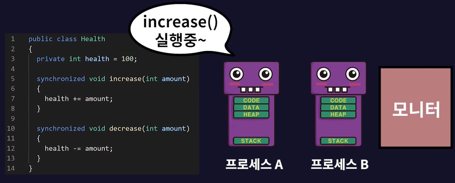 - 프로세스B에서는 increase 함수를 포함해 synchronized 키워드가 붙은 decrease 함수도 실행할 수 없다.