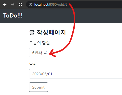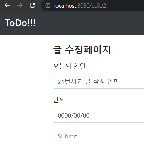 - edit.ejs에서 submit 버튼을 누르면 서버에 수정 요청을 하도록 해보자
