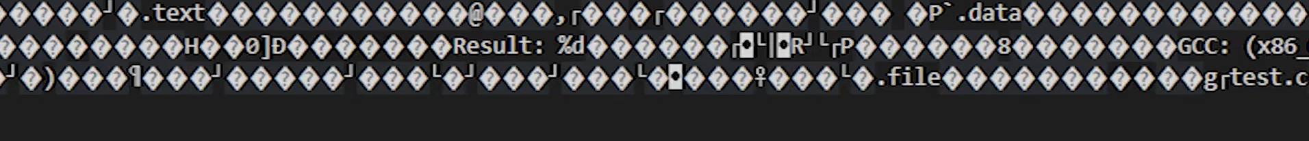 - 오브젝트 파일은 0과 1로된 기계어로 구성돼있기 때문에 text editor에서 열면 아래와 같이 글씨가 깨져보인다.