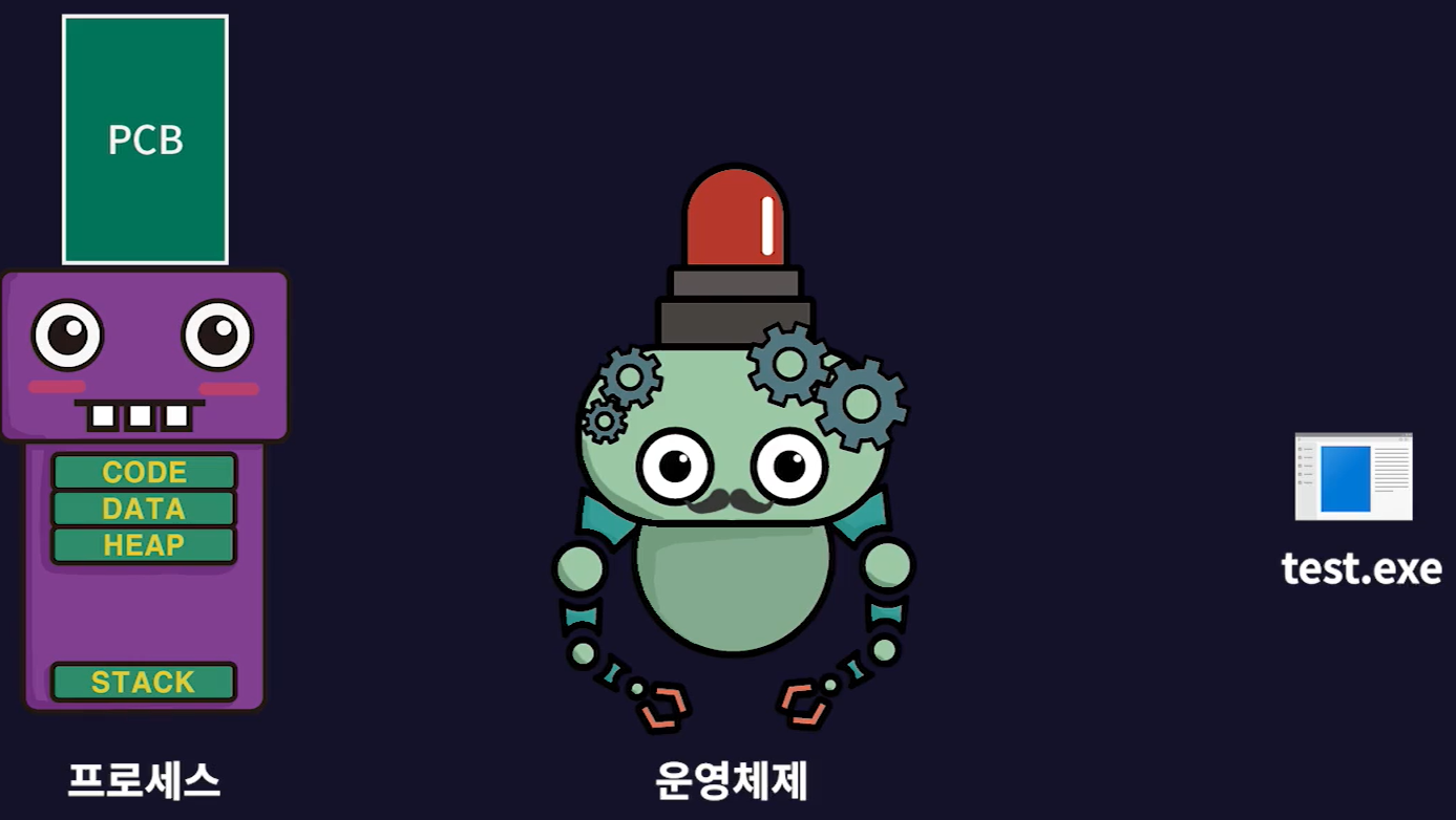 - 사용자가 exe 파일을 실행시키면 OS(운영체제)가 프로세스를 만든다.