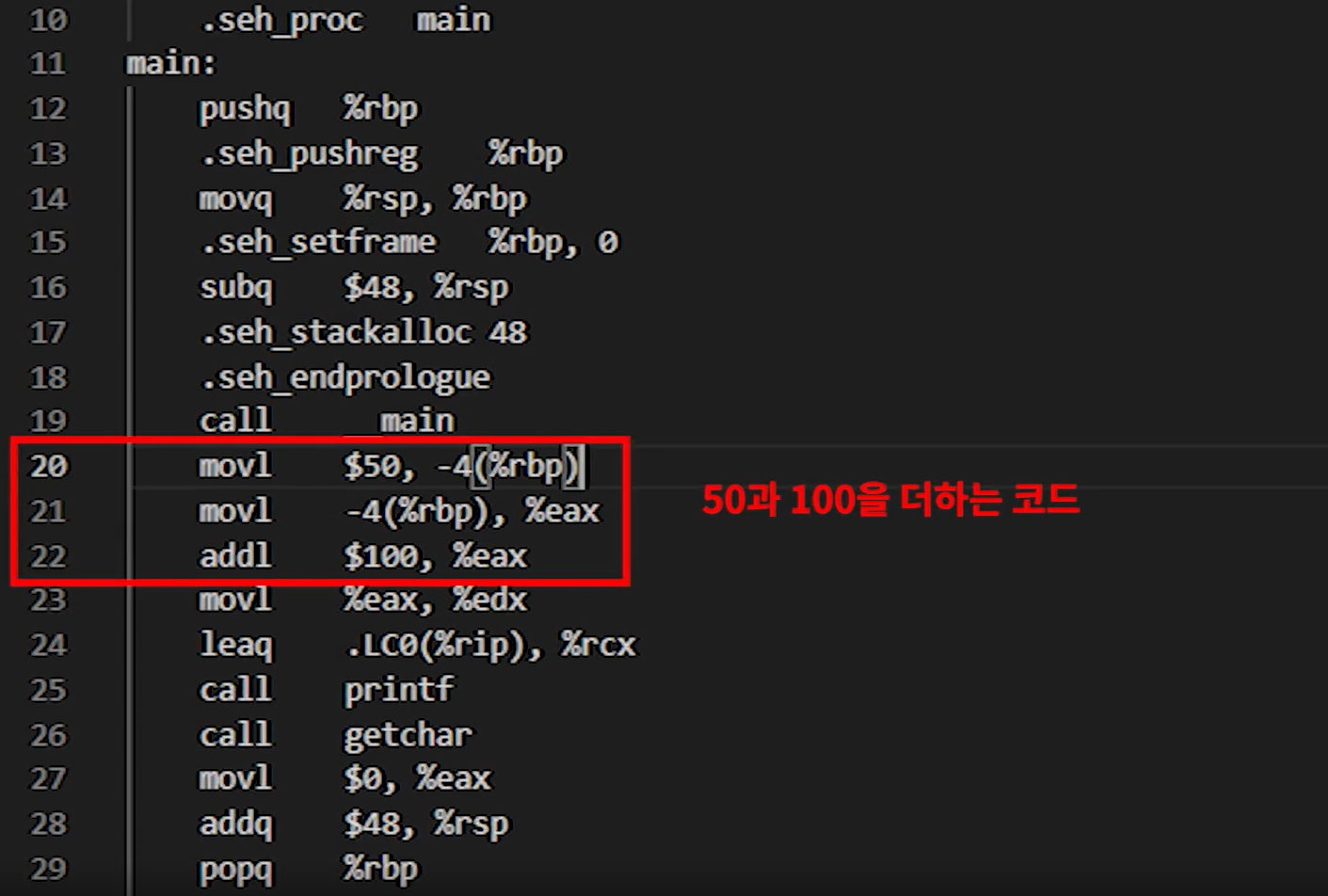 - 50과 100을 더해 출력해주는 프로그램을 C언어로 작성했다.