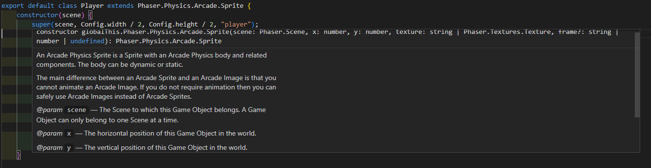 - setX와 setY는 게임 객체의 위치를 조정하는 function인데 위의 Player.js의 super function에서 보듯이 Player의 위치를 (Config.width / 2, Config.height / 2) 로 정했다.