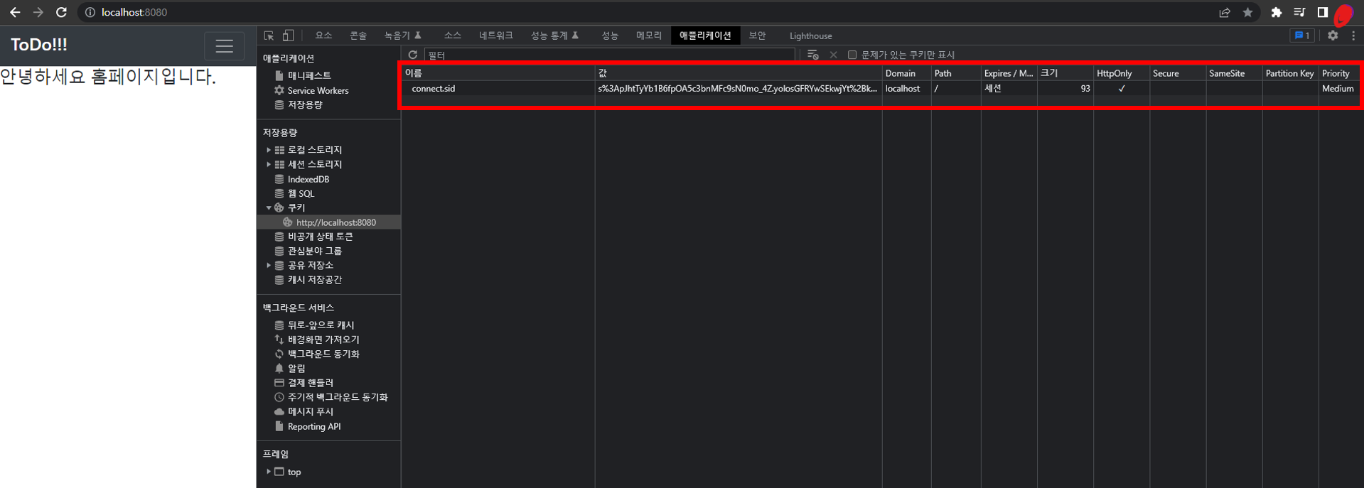 - 로그인 성공시 아래 사진과 같은 cookie가 생성되면 성공이다.