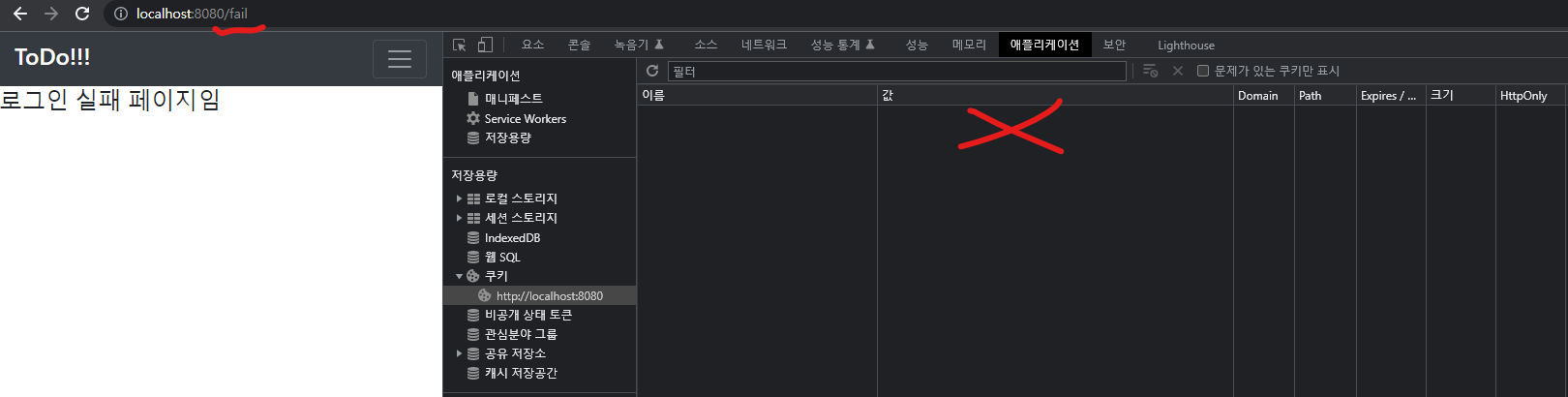 - 로그인 실패시 cookie가 생성되지 않았다.