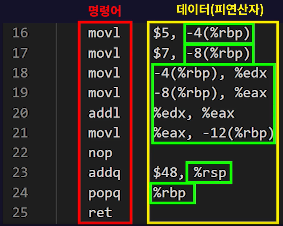 - 위의 사진은 컴파일을 할 때 생성되는 어셈블리 코드의 일부이다.(왼쪽이 명령어, 오른쪽이 데이터)