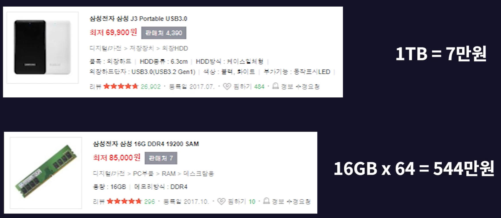 - 같은 용량의 하드디스크와 메인메모리의 가격 차이만 봐도 알 수 있다. 1TB 용량의 하드디스크는 7만원이지만 같은 용량의 RAM은 544만원이다.