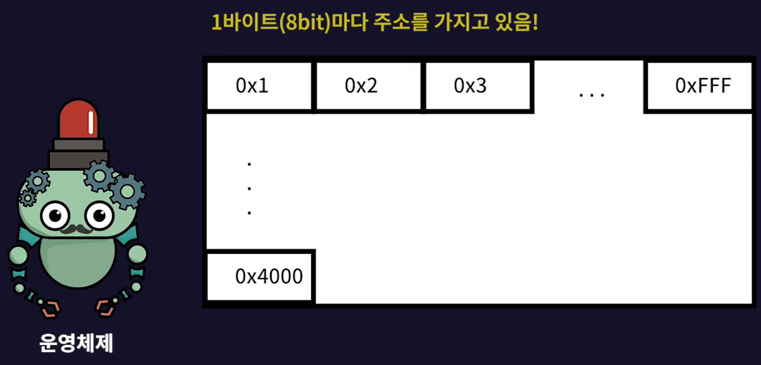 - 운영체제(OS)는 메모리를 관리하기 위해 메모리를 1byte(8bit) 크기로 구역을 나누고 숫자를 매긴다.